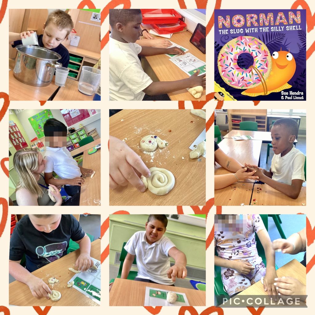 🍩 We have continued to enjoy our topic story, “Norman the slug with the silly shell”. This week we used our art lesson to create a silly shell sculpture for Norman. We mixed flour, salt and water to create a salt dough. Then we rolled it into long sausages and twisted it to make a shell. We used sequins to add some sparkle! ✨
