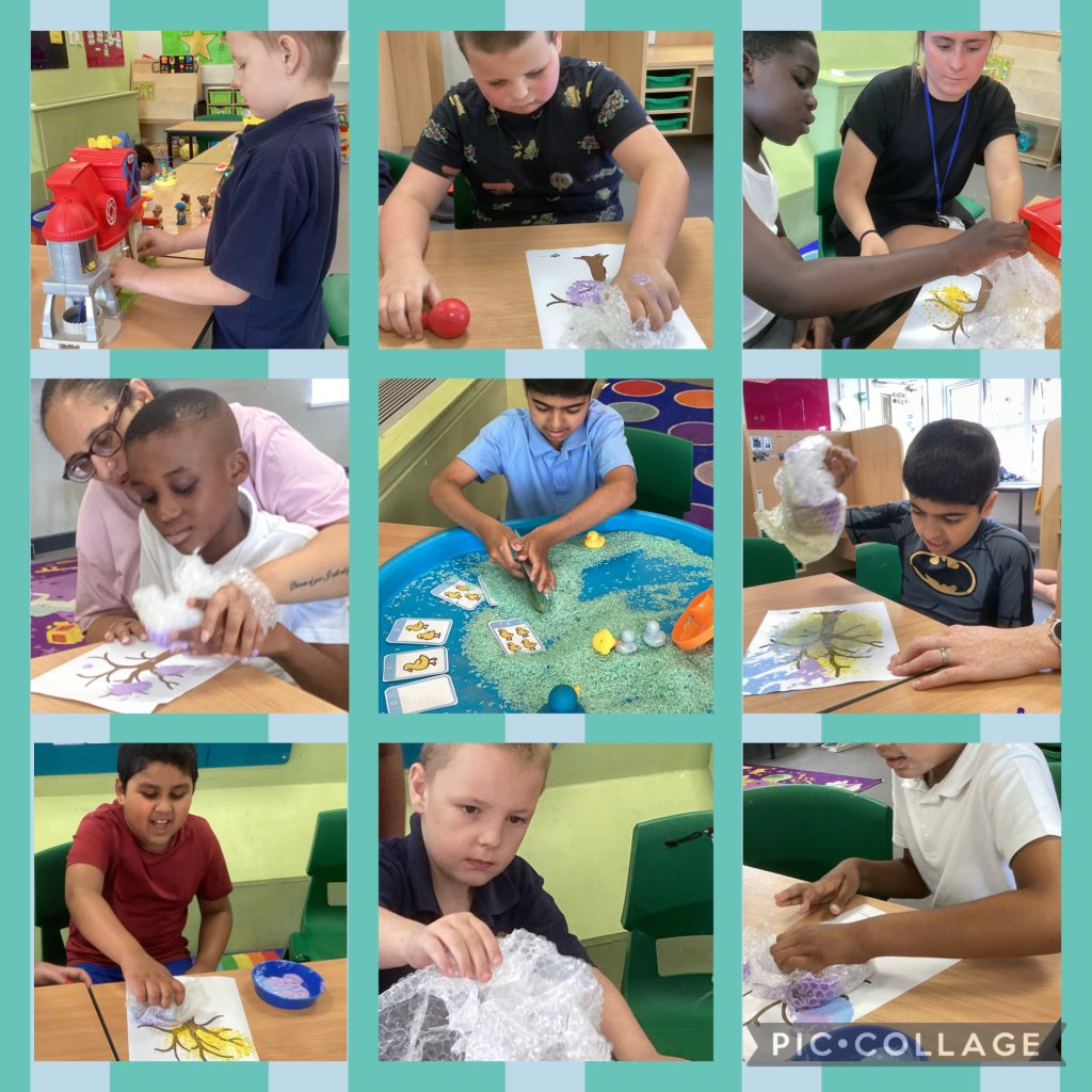 This week we continued with our farm topic! 🦆🐄🐖 Our sensory tough tray contained ducks in a pond of blue rice! We added to our farm display by painting colourful trees using scrunched up bubble wrap to create the leaves and flowers. Our art topic this half term has been painting so we are trying lots of different techniques.