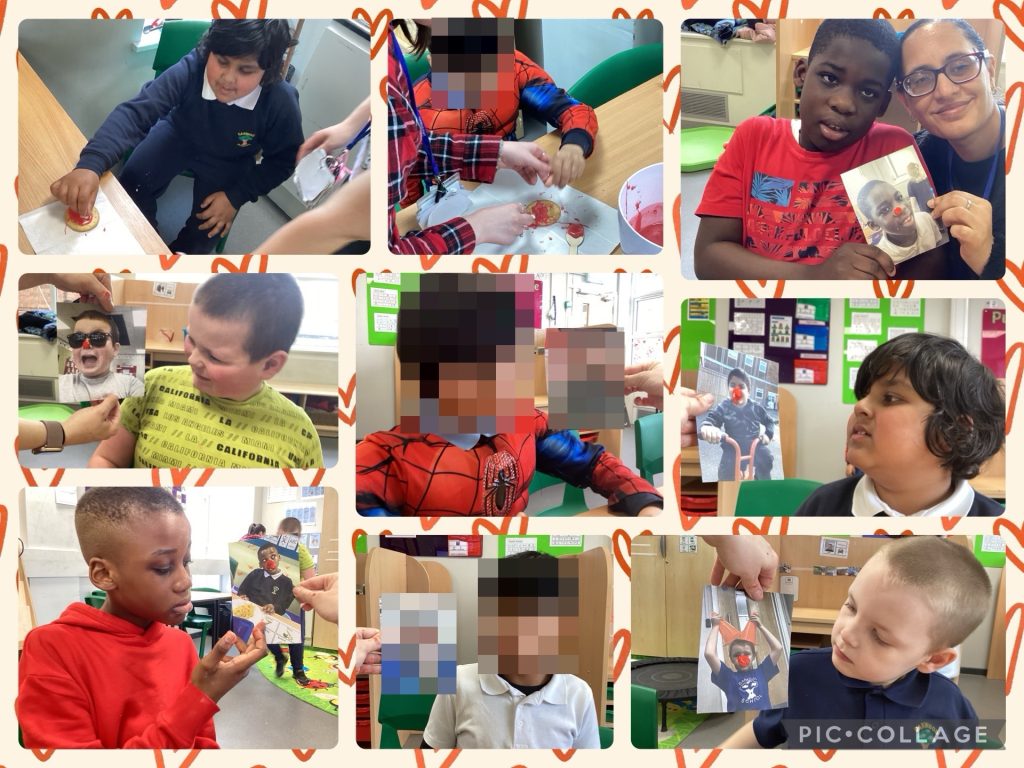 This Friday was Red Nose Day. This is an annual fundraising campaign organised by Comic Relief. The aim is to raise money to help end the cycle of poverty and ensure children are safe, healthy, educated and empowered. So in bucket today Harriet made her very own red nose, we enjoyed watching it that much we got the opportunity to then mimic her by making our own. We also made some yummy biscuits with red icing and silly eye that we all enjoyed very much. A picture of our faces was printed off and we used red paint and our fingers to create the red nose on our faces.