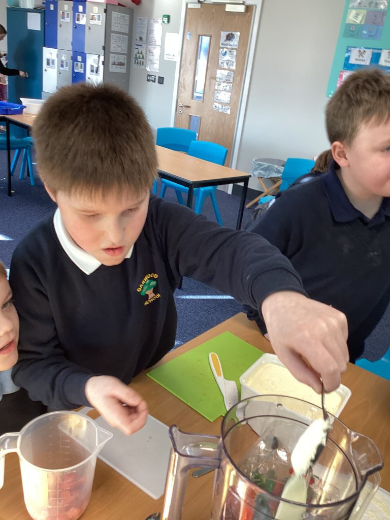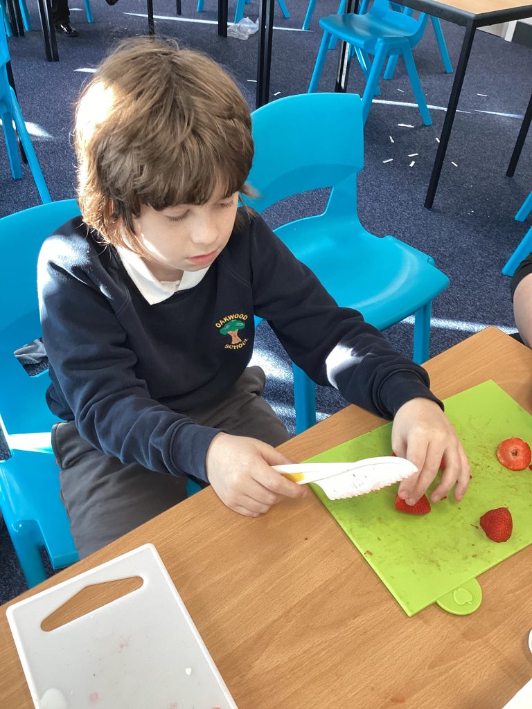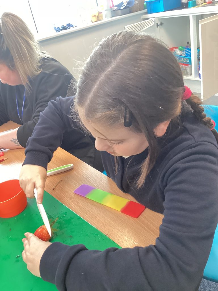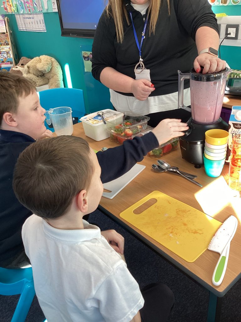 In class, we have also been talking about the difference between food and drinks and how we categorise different foods and beverages. There were some that tricked us! We used this knowledge to make a fruity milkshake. Again, we used our fantastic chopping skills to prepare the strawberries before measuring ice cream and milk. We enjoyed watching the ingredients mix together in the very noisy blender!