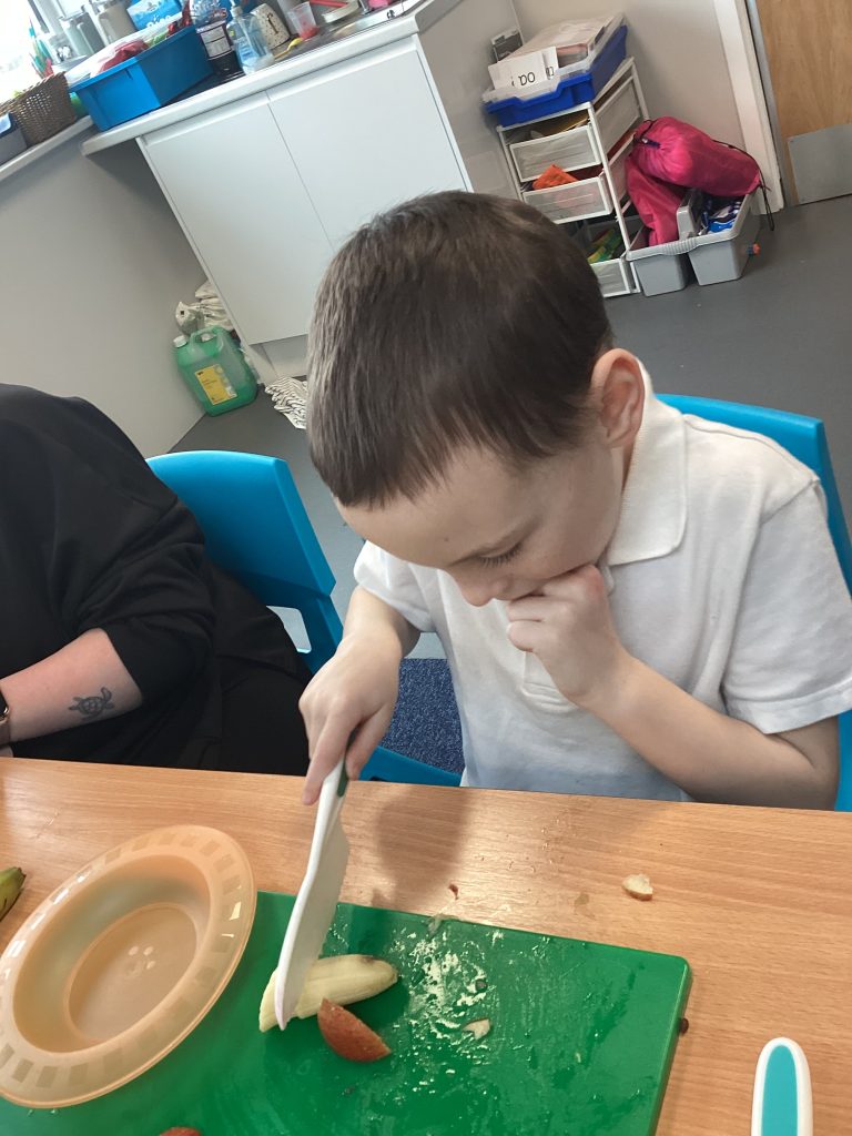 It only seemed right to use some of the different fruits during our cooking and personal development sessions. We firstly designed our own fruit salad. We thought about the different fruits and our preferences to decide which fruits we would include. The following day, we referred back to our plans to prepare our fruits before organising them within our salads. We had to apply our chopping and peeling skills throughout.