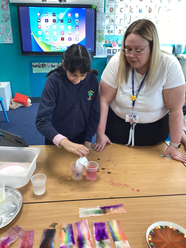 In the next colour experiment, we created our own tissue rainbows. We had to colour both ends of the paper towel, using felt tips, before placing them into two containers of water. The water absorbed into the paper towel and the felt tip colours ran through again meeting in the middle, making the most beautiful rainbows.