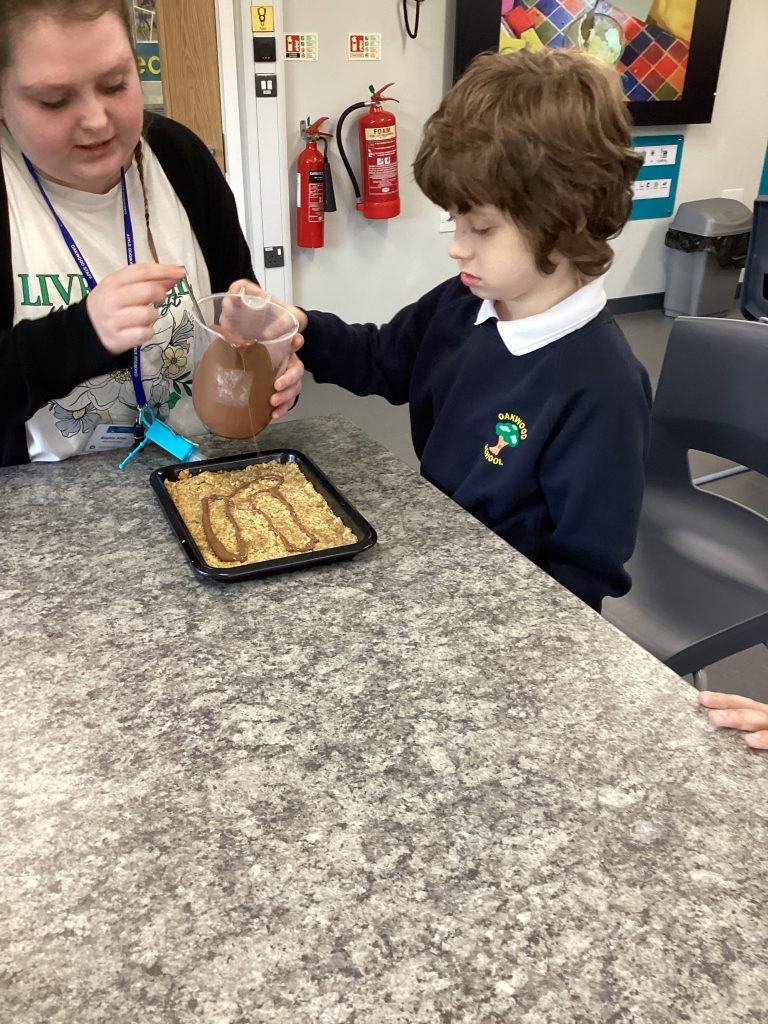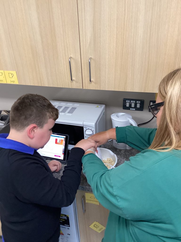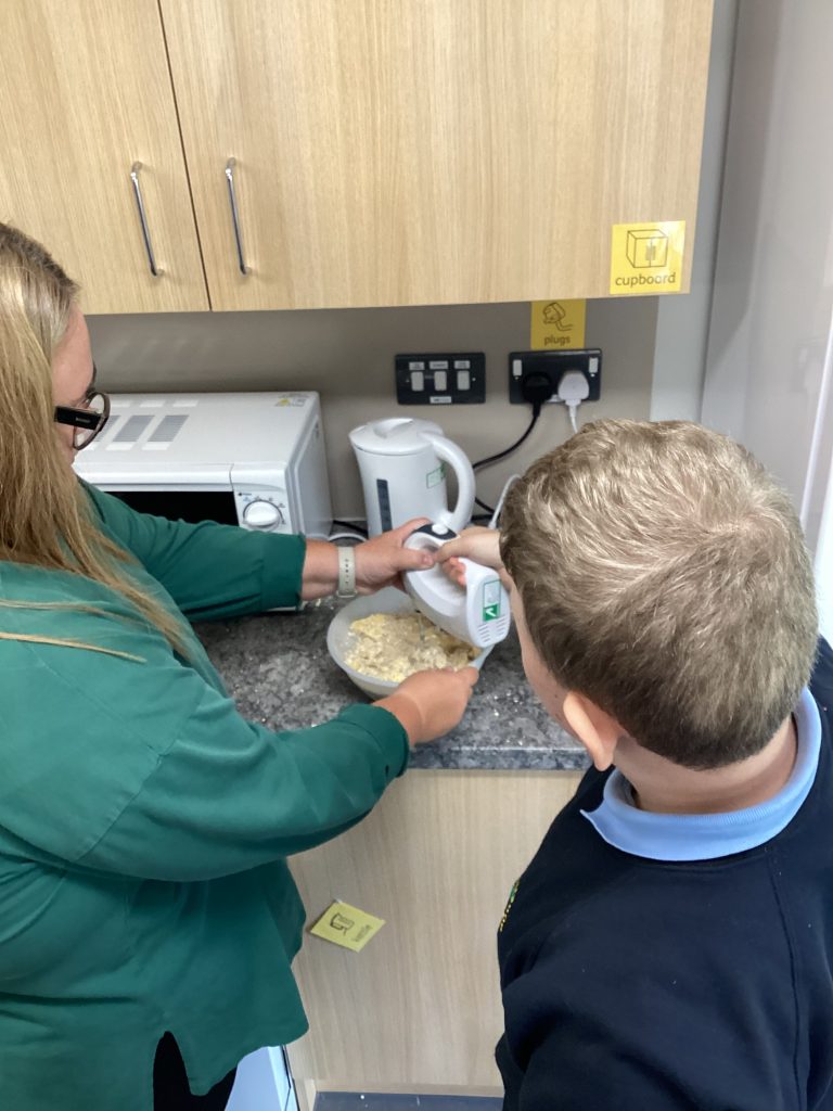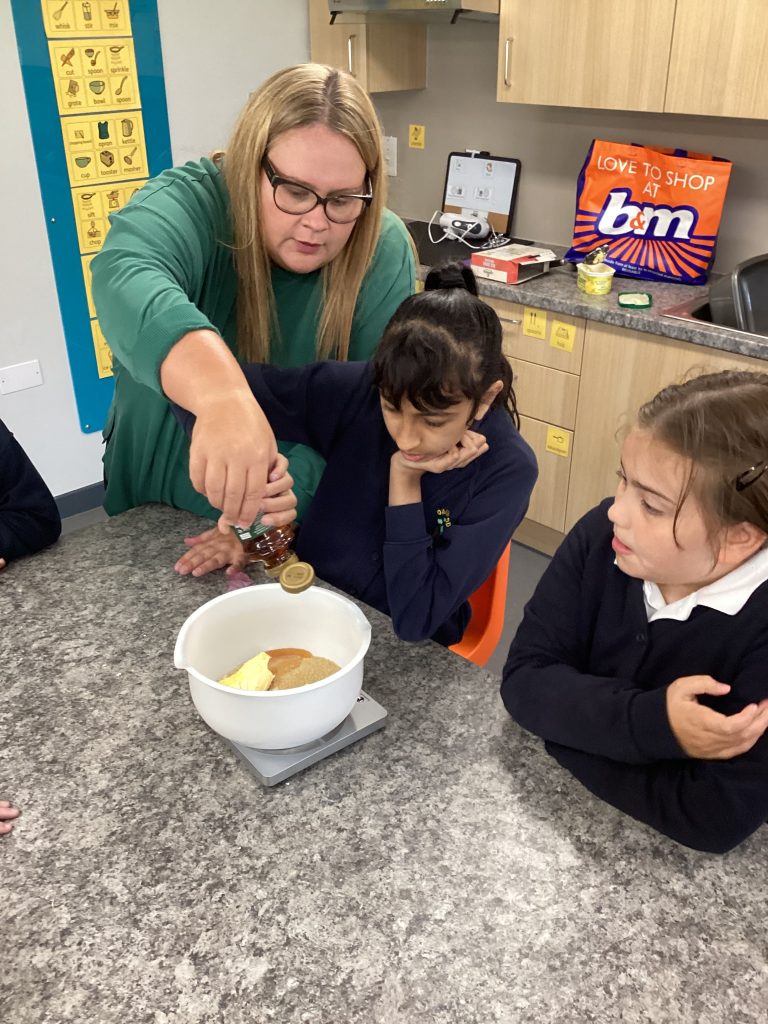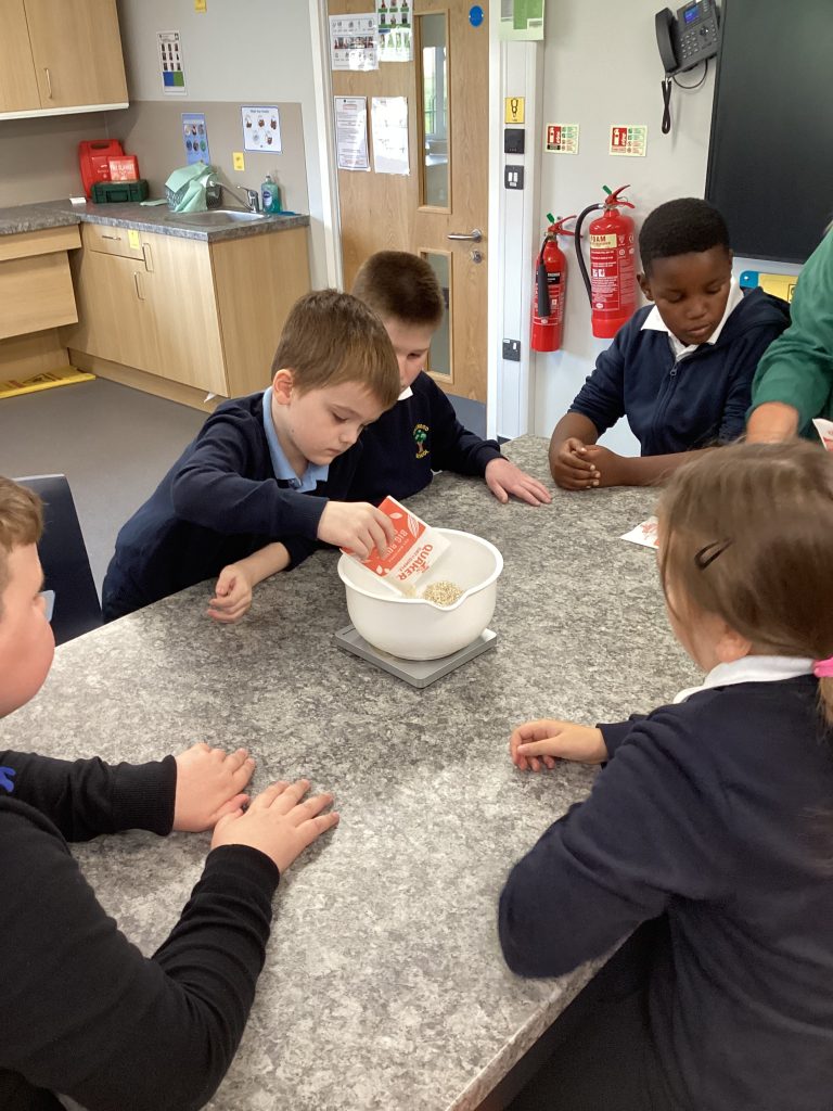 This week, during our cooking session, we have create sticky flapjack bricks, linked to our new story, ‘The Three Little Pigs’. We had to follow instructions, measure ingredients and use a range of cooking utensils.