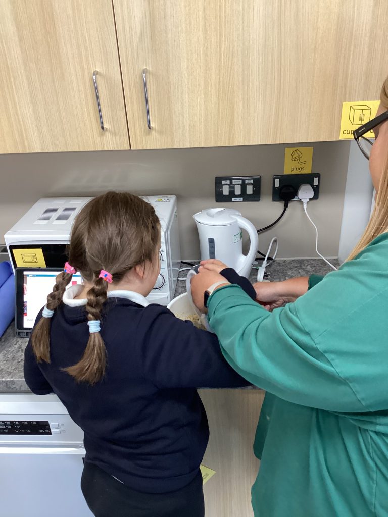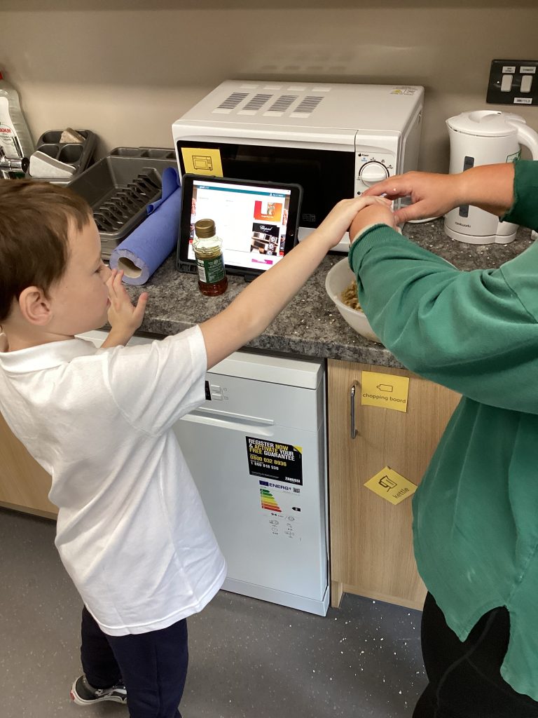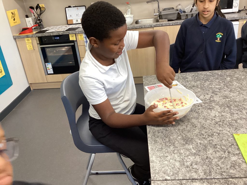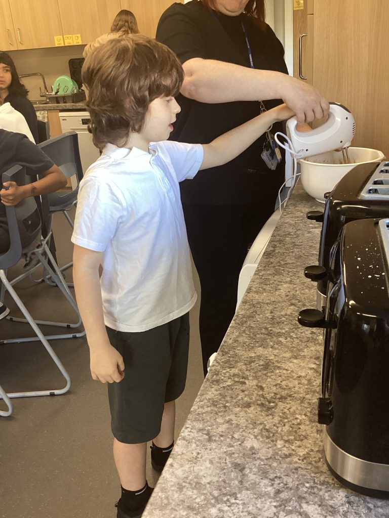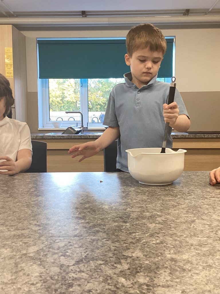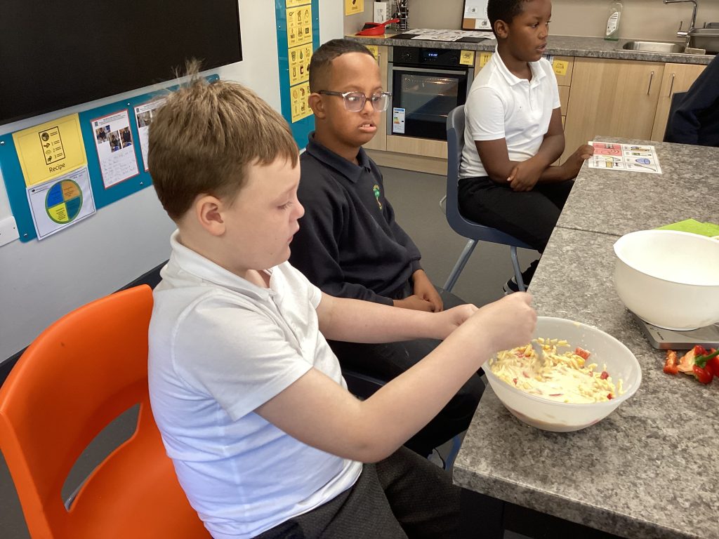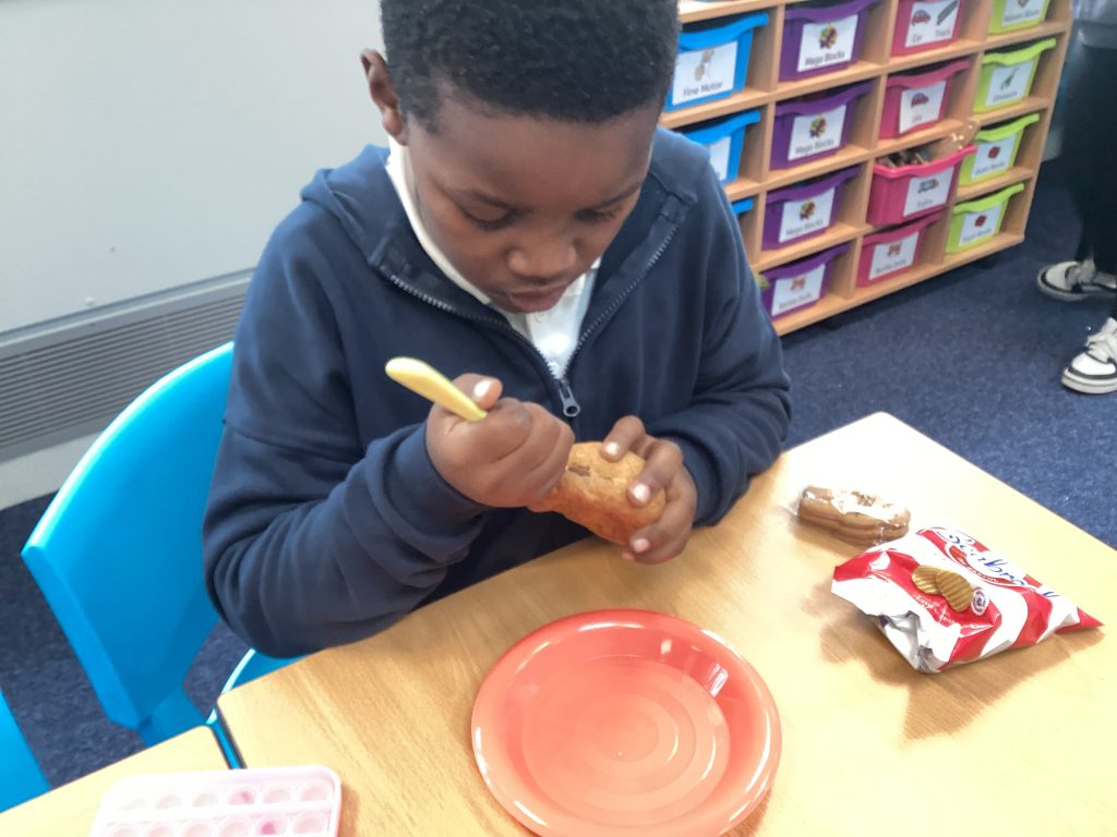 Linked with our Harvest learning, we have used vegetables – peppers and sweetcorn, to create savoury muffins during our cooking session. We chopped, poured and mixed the ingredients together before watching them rise in the oven. They were truly delicious!