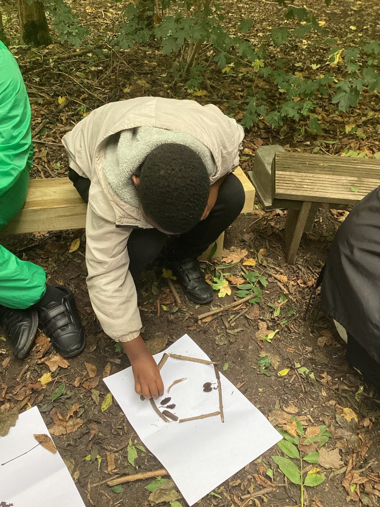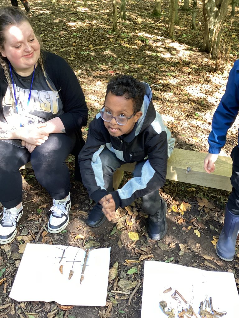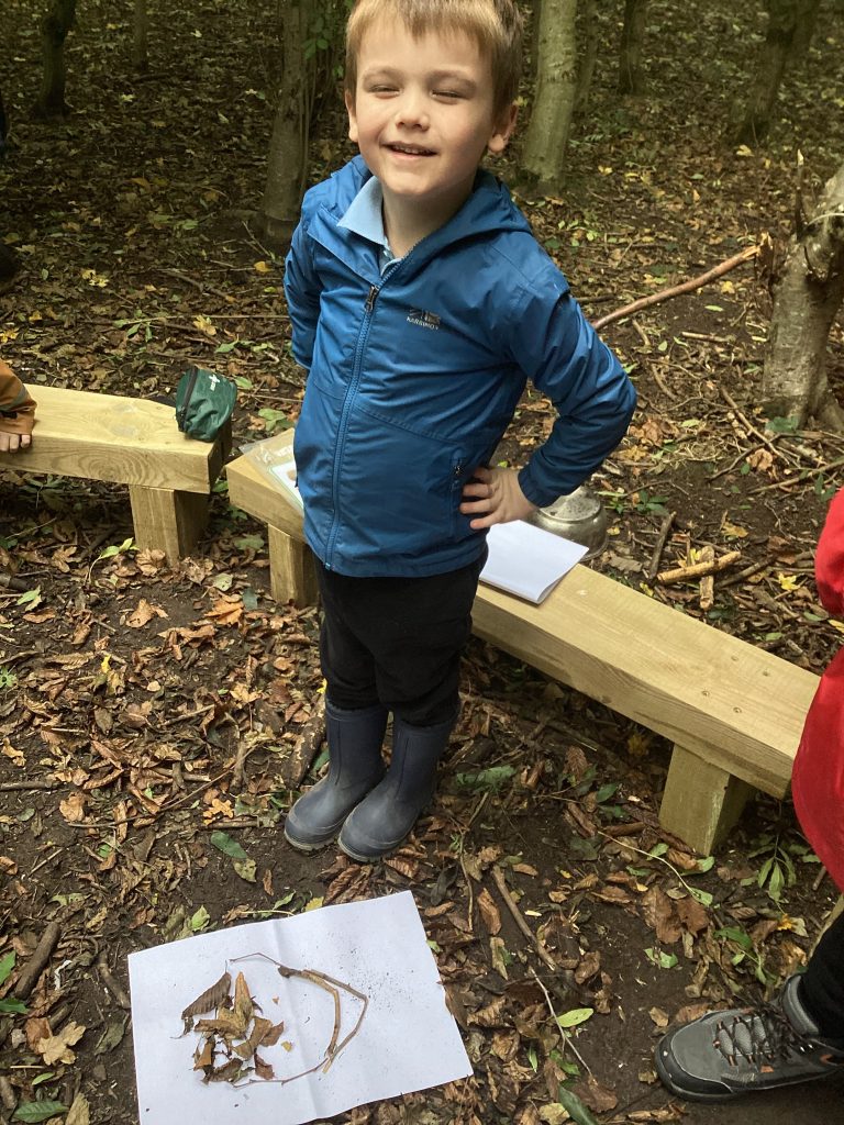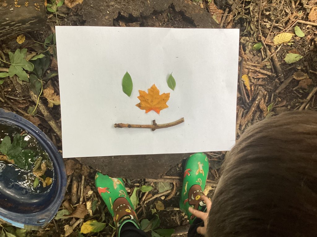 On Monday, we explored the forest area in our first woodland session. We continued to explore ‘All About Me’ by collecting natural materials such as leaves, twigs, bark and pebbles to create self-portraits. Again, we thought about what features we needed to create our faces and where they should be placed. Have a look at our super creations!