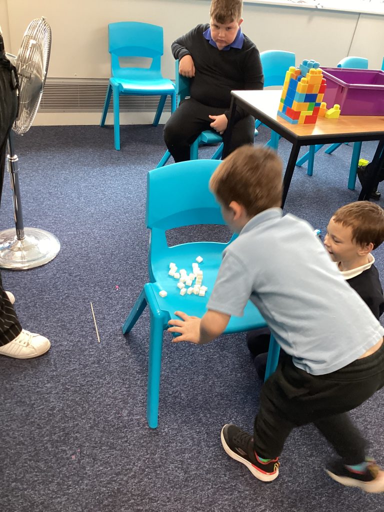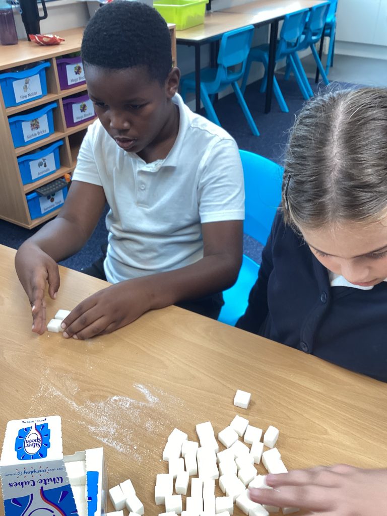 We have continued to read our topic story, ‘The Three Little Pigs’ by Nick Sharratt. In the story, the three little pigs use different materials to build their homes. The first little pig uses straw, the second little pig uses sticks and the third little pig uses bricks. In science, we wanted to investigate which materials we thought would be best to use to build a house, to stop that pesky Big Bad Wolf blowing it down. In small groups, during our science lesson, we used paper, mega blocks, sticks and sugar cubes to build our own houses. We predicted that the “strong” mega blocks would be best to build our house, just like in the story.