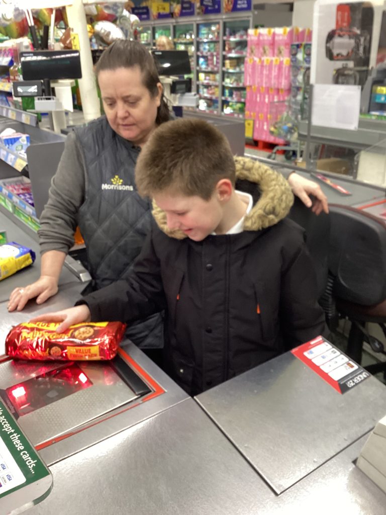 This week, we visited Morrisons, in Aldridge, for our community session. We used our shopping list to ensure we found all of the ingredients to make our pigs in pastry blankets. We had to locate, sausage meat, veggie sausages, puff pastry, eggs and flour. We are getting so good at working out which aisles we might need to look down for certain items.