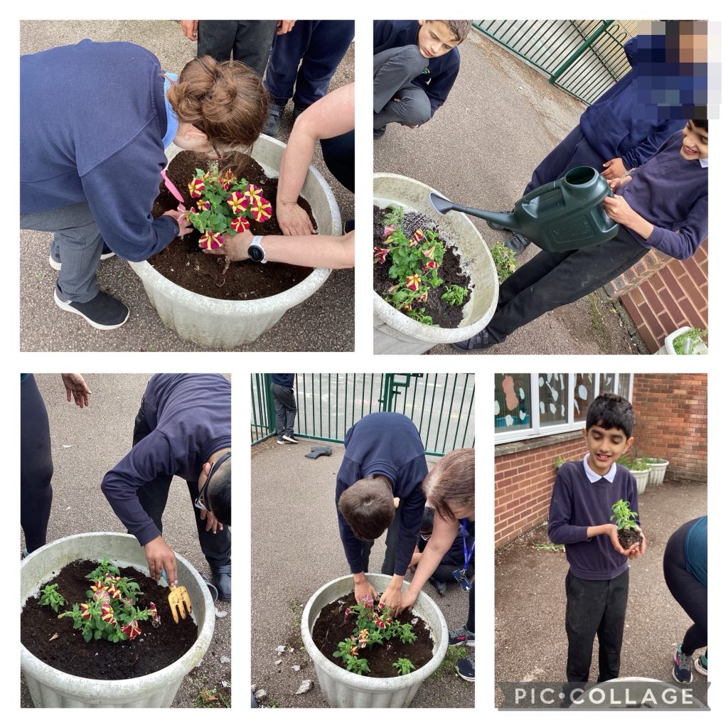 Then, when we are back at school, we went to the secondary area plant pots to plant them. First we got rid of the weeds that had built up over the winter, cleared the soil and put our flowers in. Then we gave them a good water so that they would establish over the next few weeks.